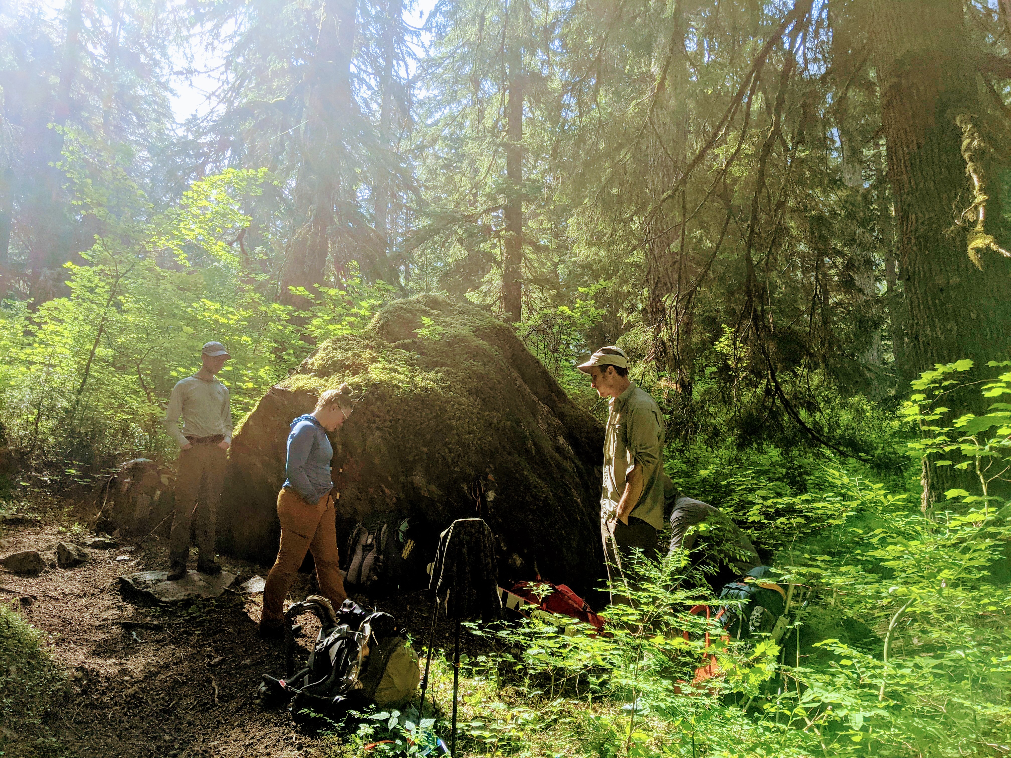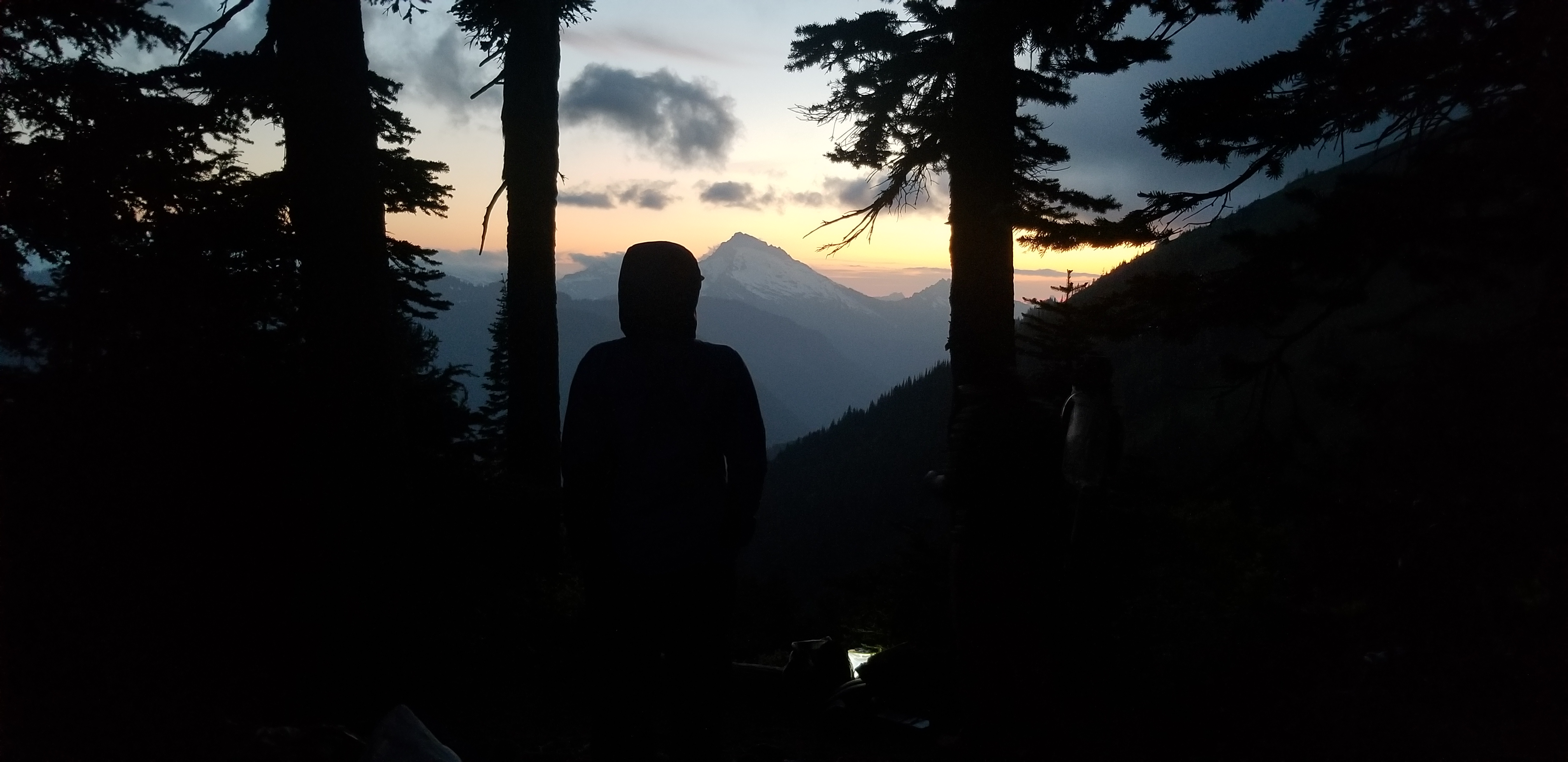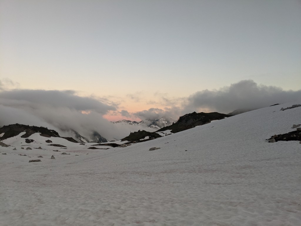 It took a whole day just to get to base camp, White Pass. We got plenty of comments on the hike up about having skis on our back in the middle of the summer. At camp, we had enough time to catch the sunset and eat dinner and were back up at 3 am to make the summit push. Kurt and I broke off from the group after a mile or so to find more snow for our skis.