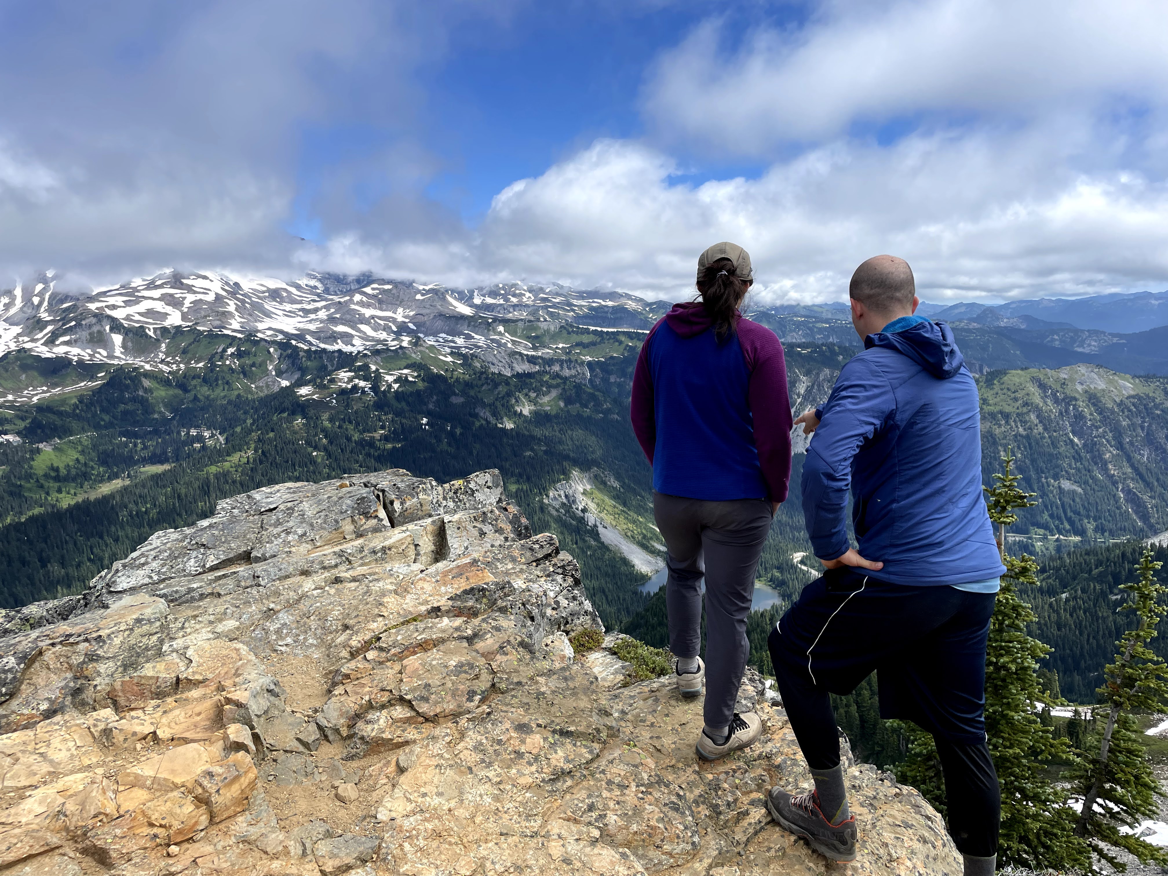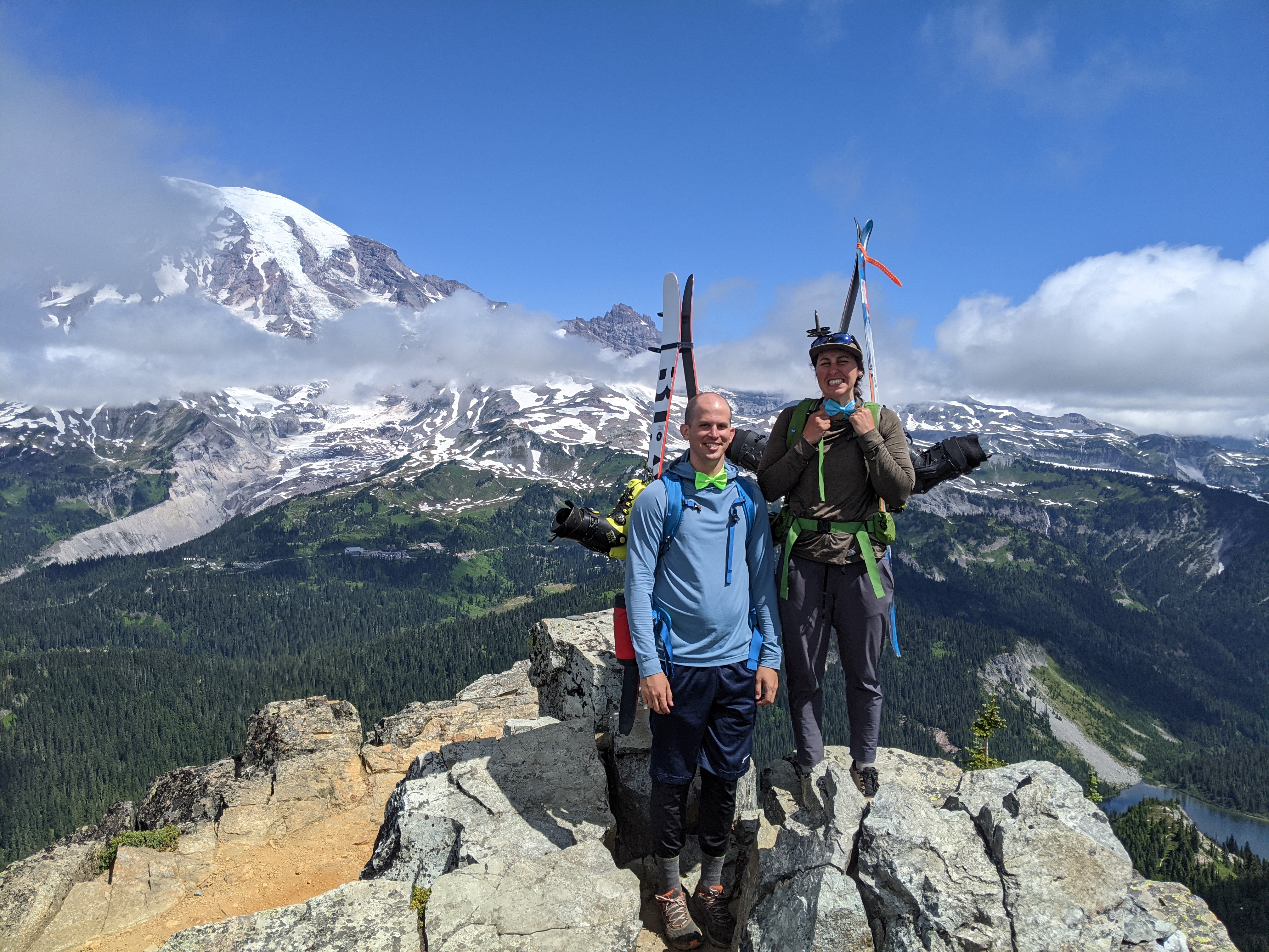 “There’s snow on this route, I promise,” said Kurt as we took off. In his defense, my statement of, “it’s all downhill from here,” is also only marginally true. We did a crumbly scramble to the top of Pinnacle Peak to have lunch. We sat at the top enjoying the view of Mt. Rainier and got a first sight of the snow and pond we would be skiing.