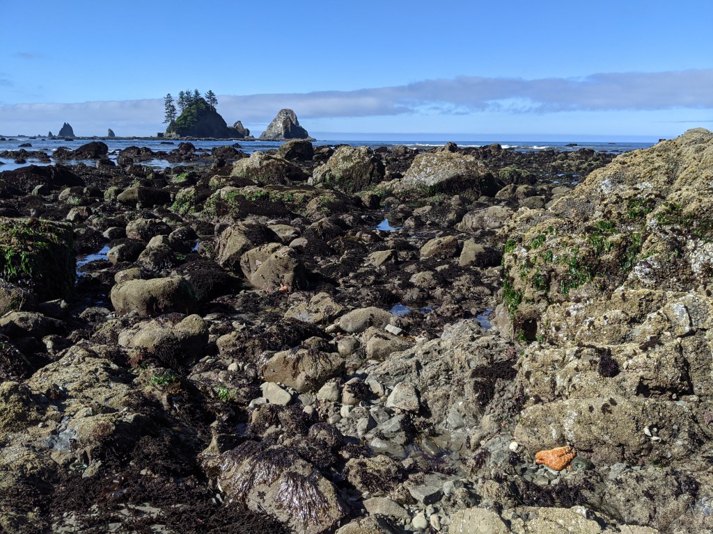 We woke up to low tide the next morning and the ocean almost seemed to mock us. There had been an above average 11 foot swing from high tide to low tide. A dry passage all the way to the sea stacks, across the seaweed covered rocks appeared as the water had seemingly disappeared.