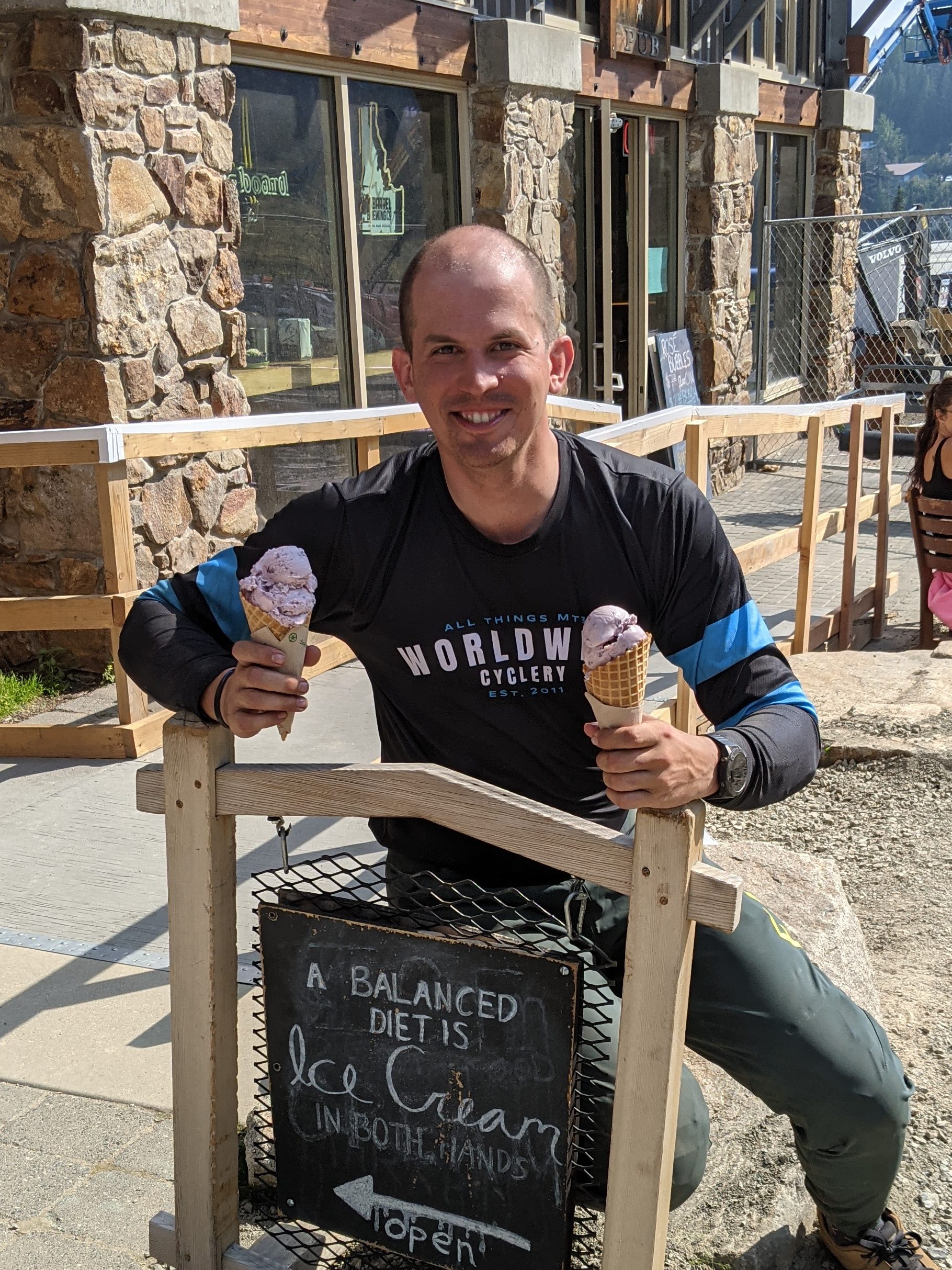 After checking the air pressure on Kurt’s tires and discovering they were rock hard, we let some air pressure out so he could get some more traction. He felt much more in control on the next run, and he got a flat. We put in a new tube and rode a little longer until he got another flat and then another. He eventually had to hike his bike up to the top and take the chair lift down. The bike shop told him they like keeping their rental fleet at 40 psi to prevent flats due to the rocky terrain… Oops.